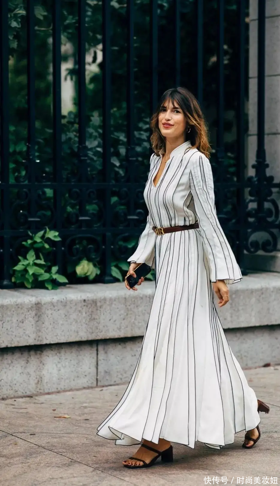 在元素上也不错打造出显瘦的成果,比如最常见然则成果最佳的竖条纹在衬衫裙上头的应用就绝顶得当微胖型的女生,身材微胖的女生在裙长的聘用上尽量尝试长裙,然则不要包裹住脚踝,稍稍带着点开叉的嗅觉搭配上竖条纹的显瘦成果,既秀出生材又不会显胖。